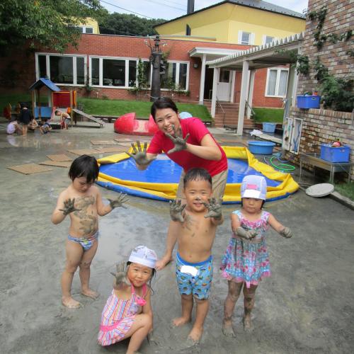年少さんは水遊びからのどろんこ遊び、年長さんはホールで組体操がっつりからのリレー練習!